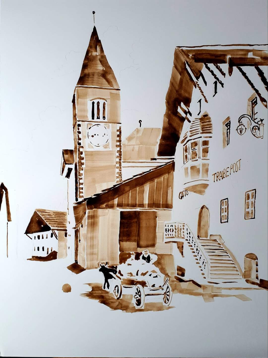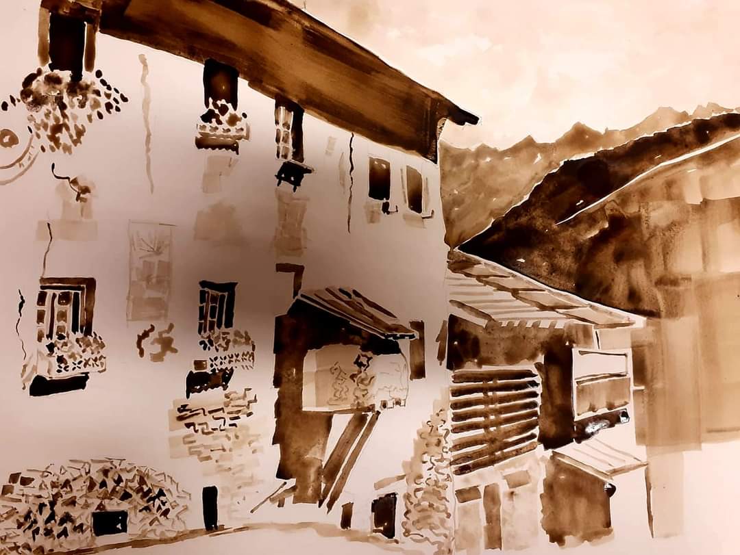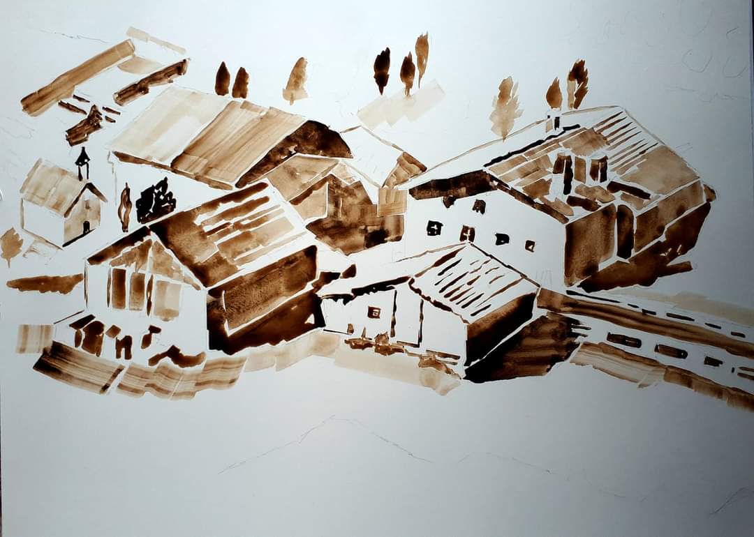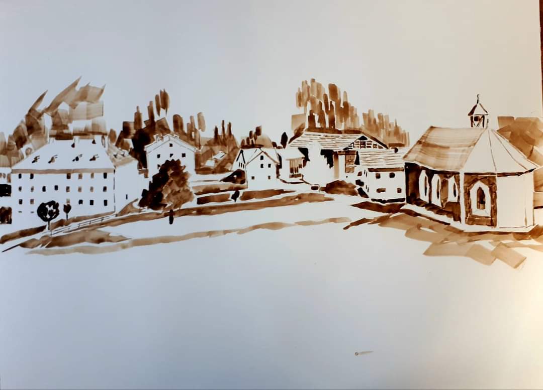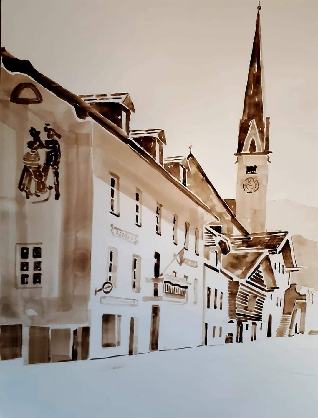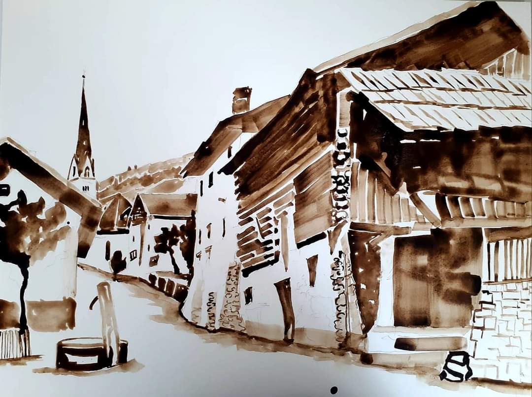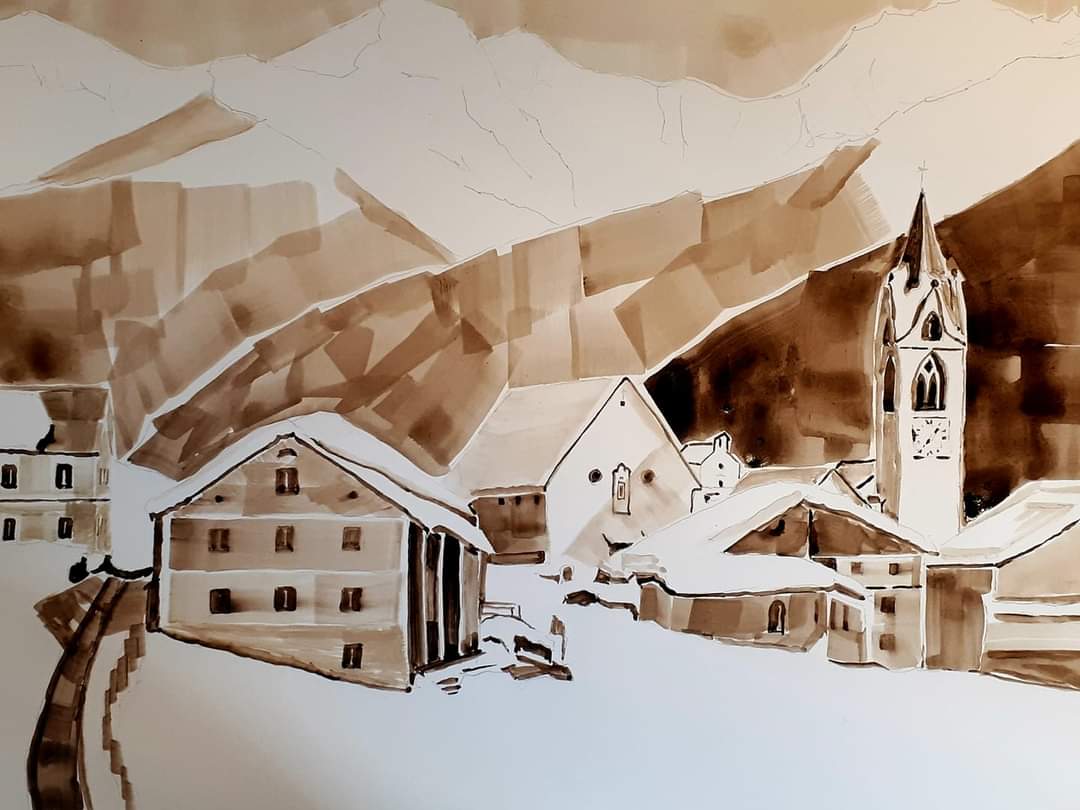 Dorfeinfahrt von Fliess im Jahre 1977 | 60×50cm